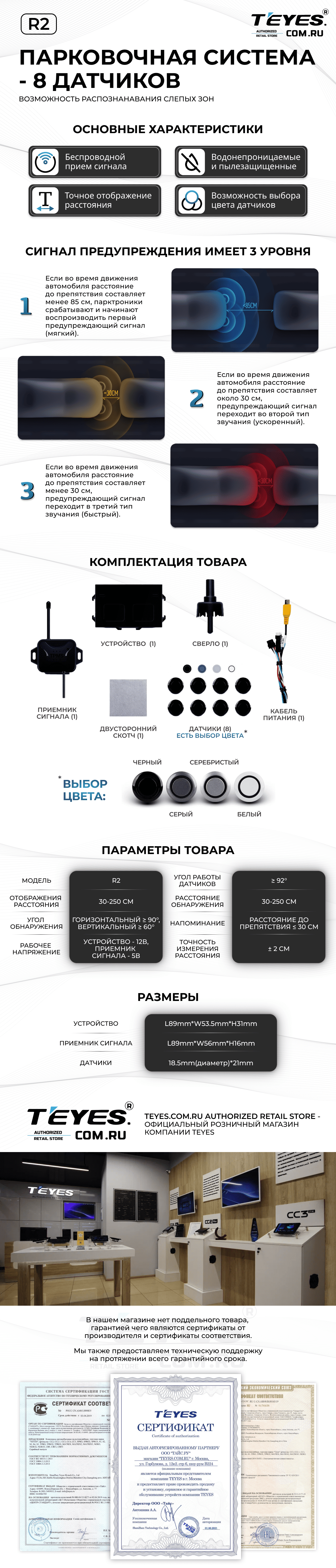 Передние и задние парктроники Teyes R2 для CC4 Pro / CC4 / CC4L / CC3 2K / CC3 / CC3L / CC2 Plus / SPRO Plus / TPRO2 / LUX ONE (Белые) 8-датчиков - купить всего за 19 900 руб. в интернет-магазине в Тамбове Teyes.com.ru. ✓ Самый лучший выбор мультимедиа ✓ Лучшая замена штатному ГУ ✓ Тел. +7 (800) 775-31-74