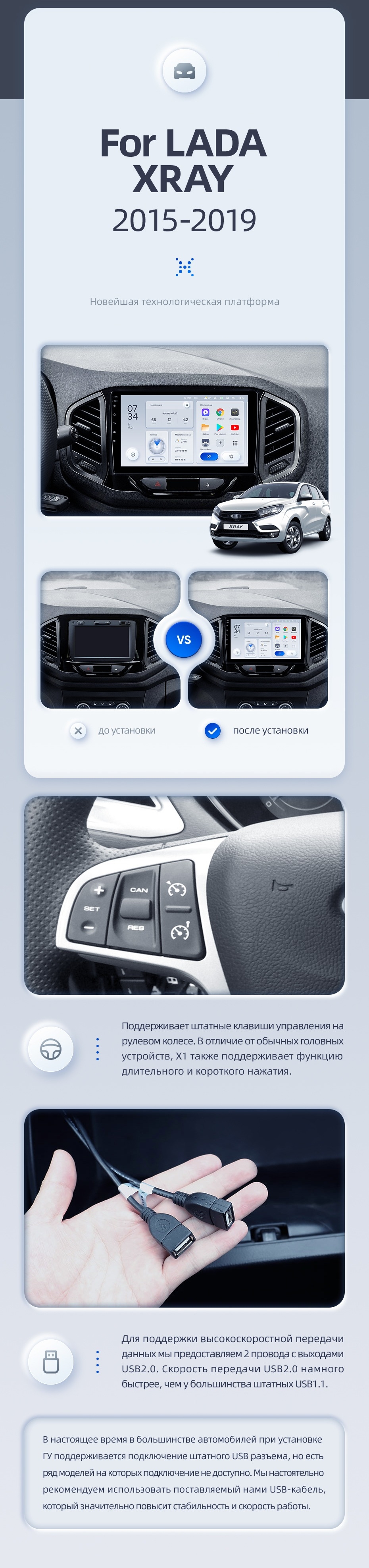 | USB | 3×USB 2.0 + USB 3.0 | Доп. аксессуары | Передняя/задняя AHD-камера, DVR-регистратор, TPMS, парковочный OBD, Type-C → HDMI |