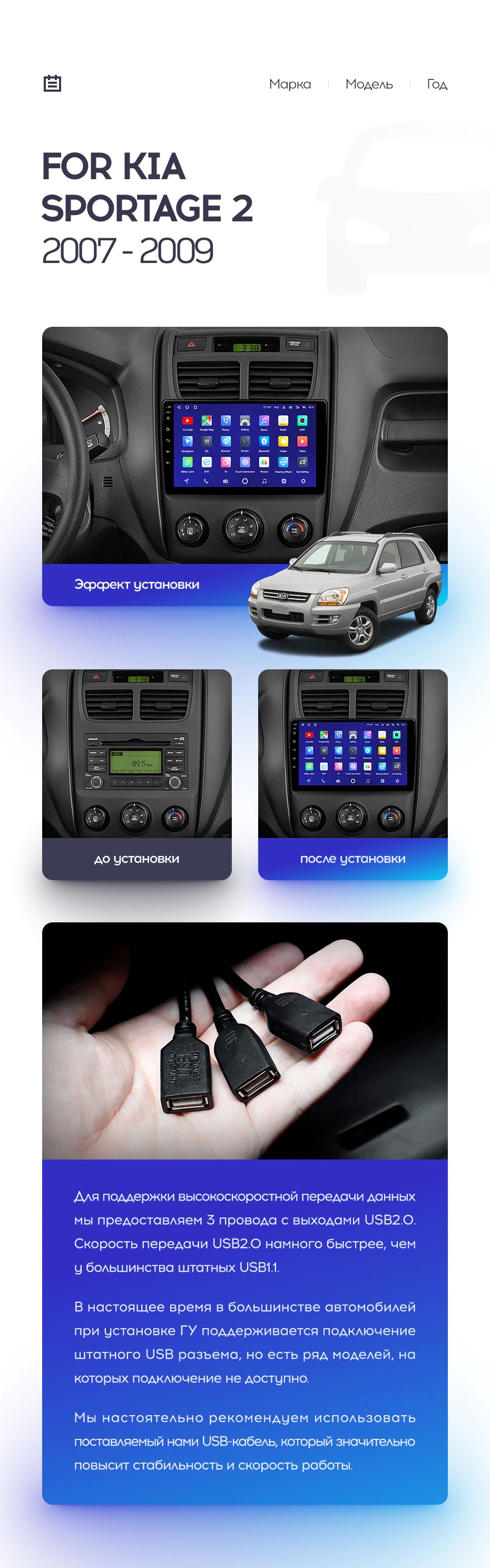 Полный комплект установки магнитолы Teyes с рамкой и проводкой можно выбрать в каталоге штатных магнитол Kia Sportage 2 (2007-2009).