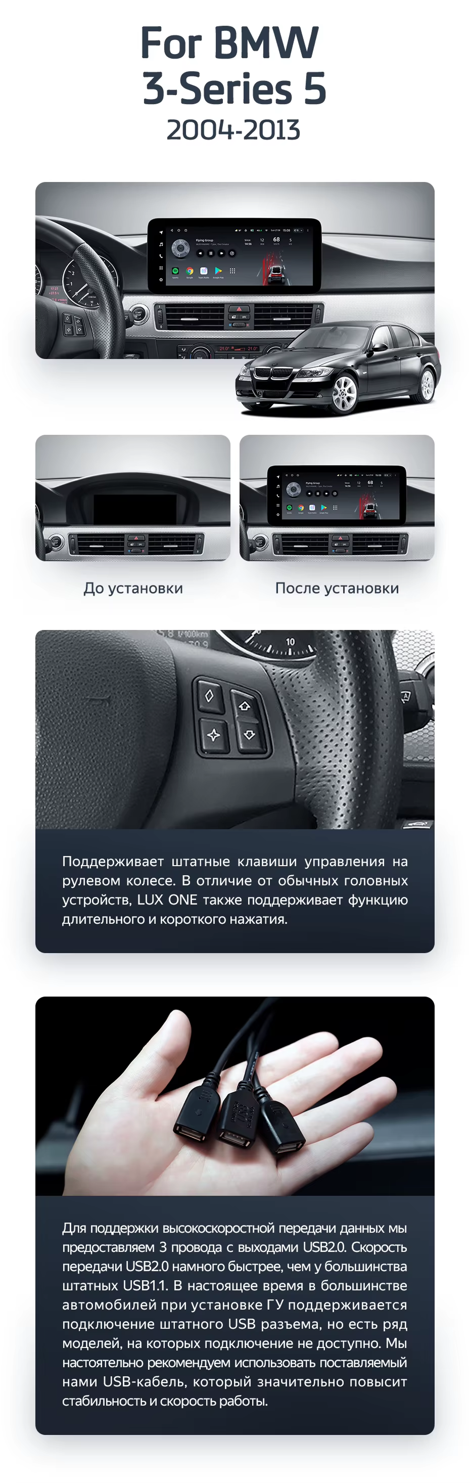 Готовый установочный комплект для магнитолы BMW 3-Series E90 E91 E92 E93 (CCC) (2004-2013) 12,3 дюйма в штатное место, включает переходную рамку и проводку.