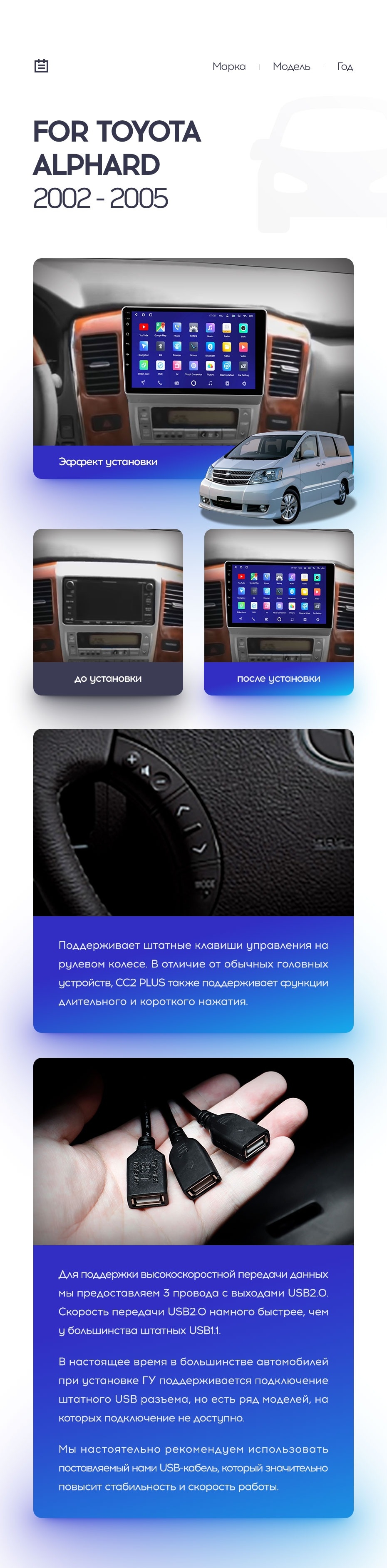 Полный комплект установки магнитолы Teyes с рамкой и проводкой можно выбрать в каталоге штатных магнитол Toyota Alphard 1 H10 (2002-2005).