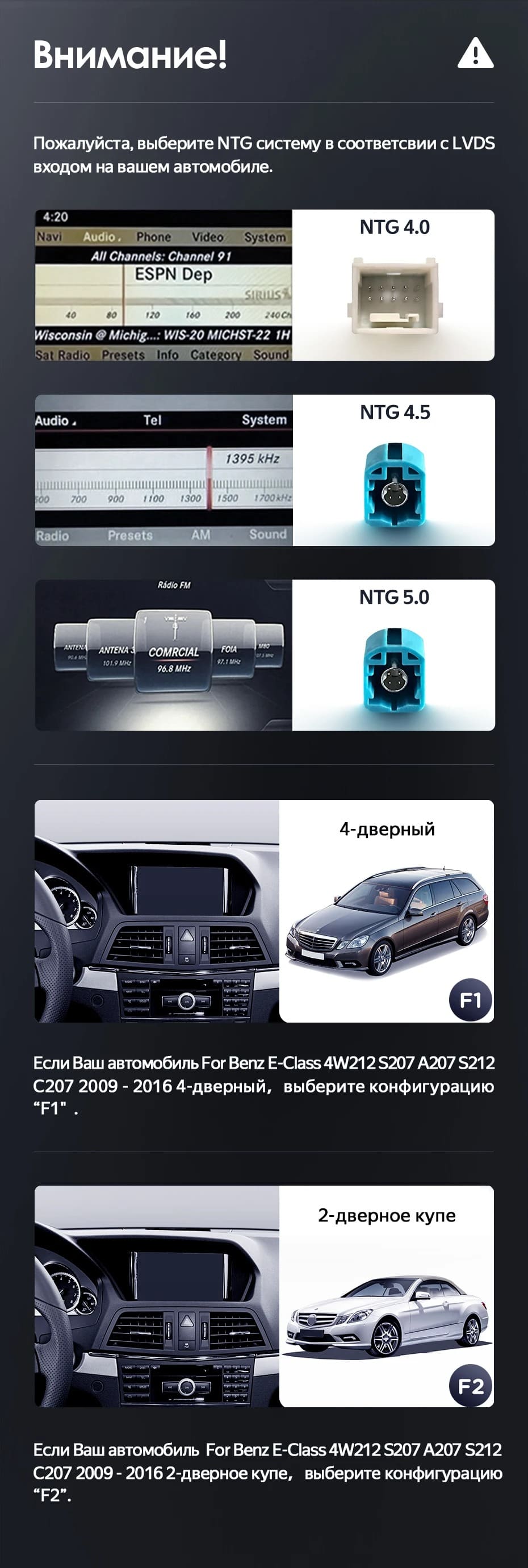 Установочный комплект для Mercedes-Benz E-Class 4 W212 S207 A207 S212 C207 (NTG 5.0) (2014-2023) включает переходную рамку и проводку.